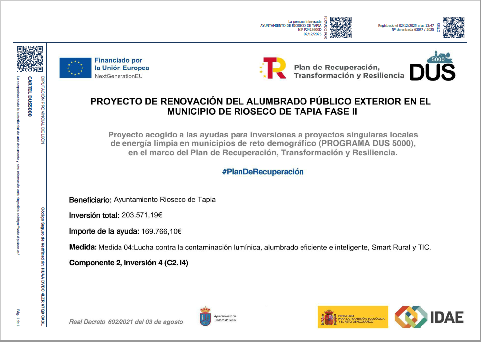 Proyecto de Renovación del Alumbrado Público exterior en el municipio de Rioseco de Tapia Fase II